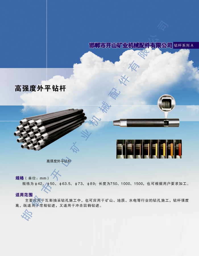 主要產(chǎn)品:鉆桿、金剛石鉆頭、煤截齒、螺旋鉆桿、支護、刮板機、鐵路配件、配套鉆具