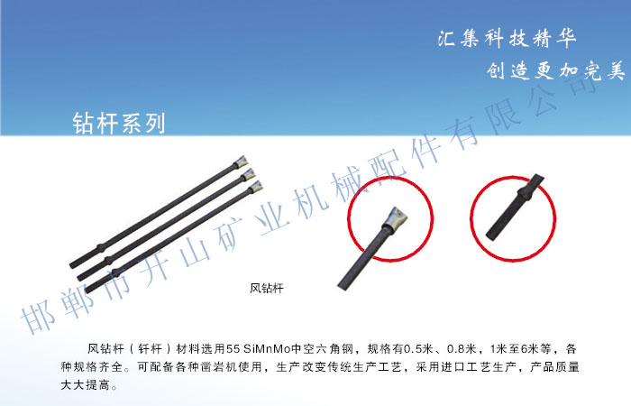 風(fēng)鉆桿與鉆頭連接出螺紋為內(nèi)M14×1.5或方牙,長(zhǎng)度0.4~2.8米,具體長(zhǎng)度及連接方式應(yīng)在合同注明。錨索鉆桿長(zhǎng)度為1米/根,用戶需其他規(guī)格可定制。