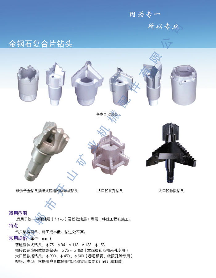 邯鄲市開山礦業(yè)機械配件有限公司是邯鄲地區(qū)專業(yè)生產(chǎn)鐵路工礦配件的大型企業(yè),企業(yè)占地5500余平方米, 員工139余人,其中高級技師11名。企業(yè)擁有先進的生產(chǎn)設(shè)備多套,高標準的技術(shù)人員,完善的檢測手段,從而保 證了產(chǎn)品的質(zhì)量。多年來,始終以一流的產(chǎn)品質(zhì)量,一流的商業(yè)信譽服務(wù)客戶。本廠專業(yè)生產(chǎn):錨桿、煤鉆桿、 風鉆桿、煤鉆頭、錨桿鉆頭、風鉆頭、金剛石鉆頭、復(fù)合片鉆頭、空心螺旋鉆桿、探水鉆桿、鉆尾、接頭、采煤 機配件、鎬型截齒、刀型截齒、鐵路配件。